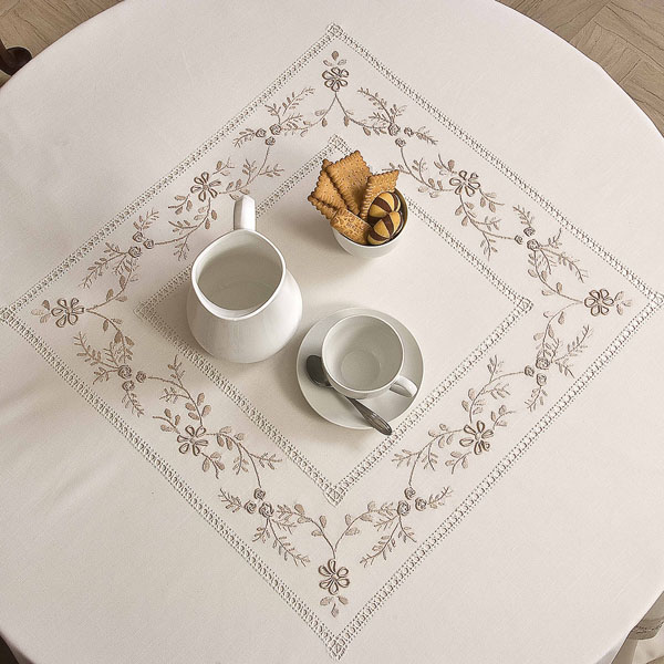 Ανάγλυφα, περίτεχνα ανθάκια κεντημένα στο χέρι σε εργασία τύπου ροκοκό καθιστούν αυτό το τραπεζομάντηλο ιδανικό, τόσο για τη διακόσμηση του χώρου σας όσο και για γεύμα.