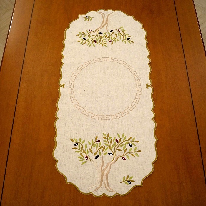Όμορφο ράνερ διακοσμημένο με το δέντρο της ελιάς και κυκλικό σχέδιο μαιάνδρων σε κέντημα μηχανής. Μια ιδιαίτερη πινελιά στο χώρο σας.