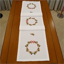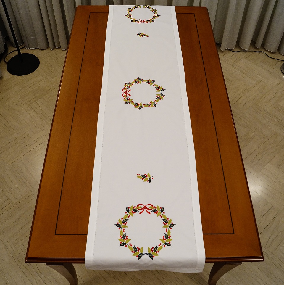 Όμορφο λευκό ράνερ διακοσμημένο με στεφάνια από γκι σε κέντημα μηχανής. Μια ιδιαίτερα εορταστική πινελιά στο χώρο σας.